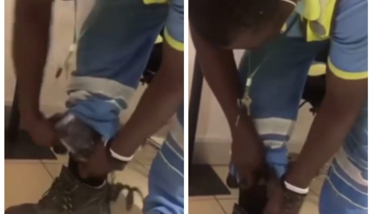 In a video that has since gone viral, the security man is seen removing the phones from different sides of his working gear to the shock of onlookers after his arrest.