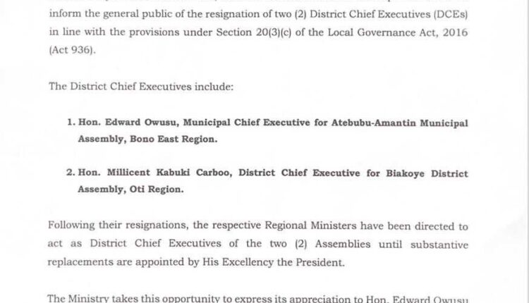 The resignation of Edward Owusu, MCE for Atebubu-Amantin in the Bono East Region and Millicent Kabuki Carboo, DCE for Biakoye in the Oti Region was announced on Thursday, October 10 in a statement by the Ministry of Local Government, Decentralisation and Rural Development.