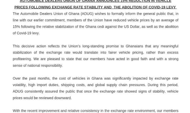The Automobile Dealers Union of Ghana (ADUG) has announced an average 15% reduction in vehicle prices across the country.