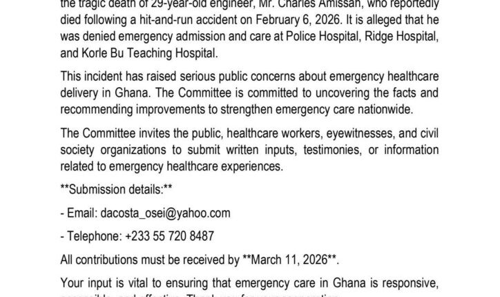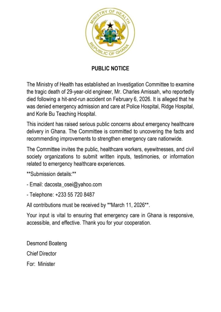 In a statement issued by the ministry, the committee has been tasked with examining the events leading to Mr Amissah’s death after he reportedly suffered injuries in a hit-and-run accident on February 6, 2026.