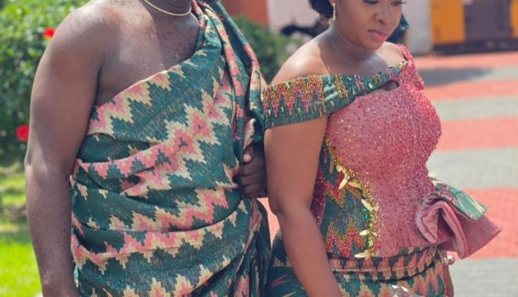 Basking in euphoria, the two were spotted in green and peach kente outfit with the actress adorned with beads.