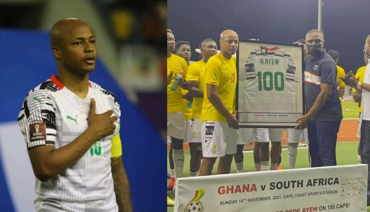 Captain Andre Ayew was honored last Sunday at the Cape Coast Stadium during the game between the Black Stars and their counterparts from South Africa on his 100th appearance for the national team.