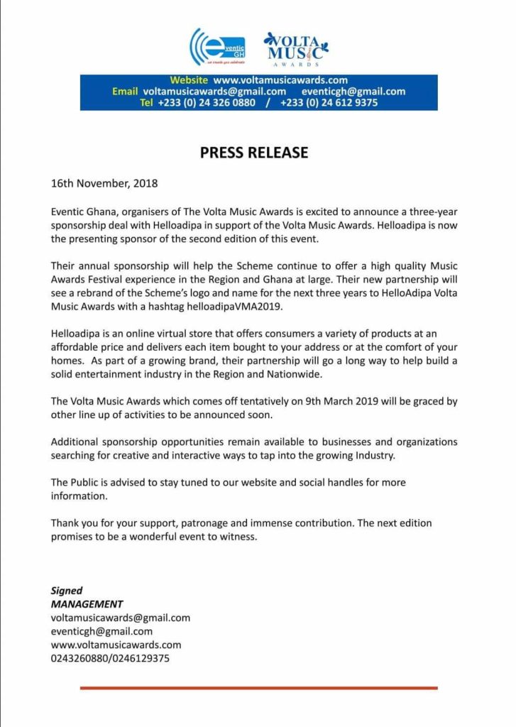 The good news however to the general public is, “helloAdipa” an online shop which enables people to shop nation wide is signing 3 years contract with Eventic GH making them the headline sponsors of Volta Music Awards which will now be changed to “helloAdipa Volta Music Awards”.